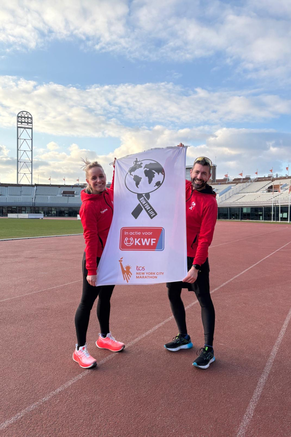 In 2016 heb ik mijn man Rémi leren kennen, en gelukkig delen wij de passie voor sport en het aangaan van uitdagingen. We pakken samen af en toe de racefiets, padellen, bootcamp, hiken, tennissen en sinds kort ook hardlopen. In 2023 hebben we samen de top van de Kilimanjaro bereikt, een onvergetelijk moment! Dat jaar hebben we ruim 3 maanden gereisd, want wij realiseren ons allebei heel goed dat je herinneringen moet maken want je weet nooit hoe lang het nog kan. Wij hebben namelijk helaas allebei een ouder moeten verliezen aan kanker. In 2015 is mijn moeder na een ziekbed van 2 maanden overleden aan eierstokkanker. Die periode was een rollercoaster, maar ook een periode waarin ik veel heb geleerd. Over mijzelf, over het leven in z’n algemeenheid en hoe ik mijn leven vanaf dat moment wil invullen. Vlak voordat mijn man en ik elkaar in 2016 leerden kennen, is hij zijn vader verloren. Niet het onderwerp waar je tijdens je eerste dates mee bezig zou willen zijn, maar bij ons realiteit en het heeft een stabiele basis in onze relatie gelegd. Nu een aantal jaren later, willen wij samen weer (na de Kilimanjaro) een uitdaging aangaan. Eentje waarbij we onze ouders trots kunnen maken en een uitdaging die wij nooit meer gaan vergeten. De New York City Marathon in 2025, 10 jaar nadat mijn moeder is overleden, om vervolgens zoveel mogelijk geld op te halen voor KWF Kankerbestrijding. Geld wat gebruikt gaat worden voor kankeronderzoek, zorg en ondersteuning voor iedereen die geraakt is door kanker. Een mooier doel kan ik niet bedenken.”